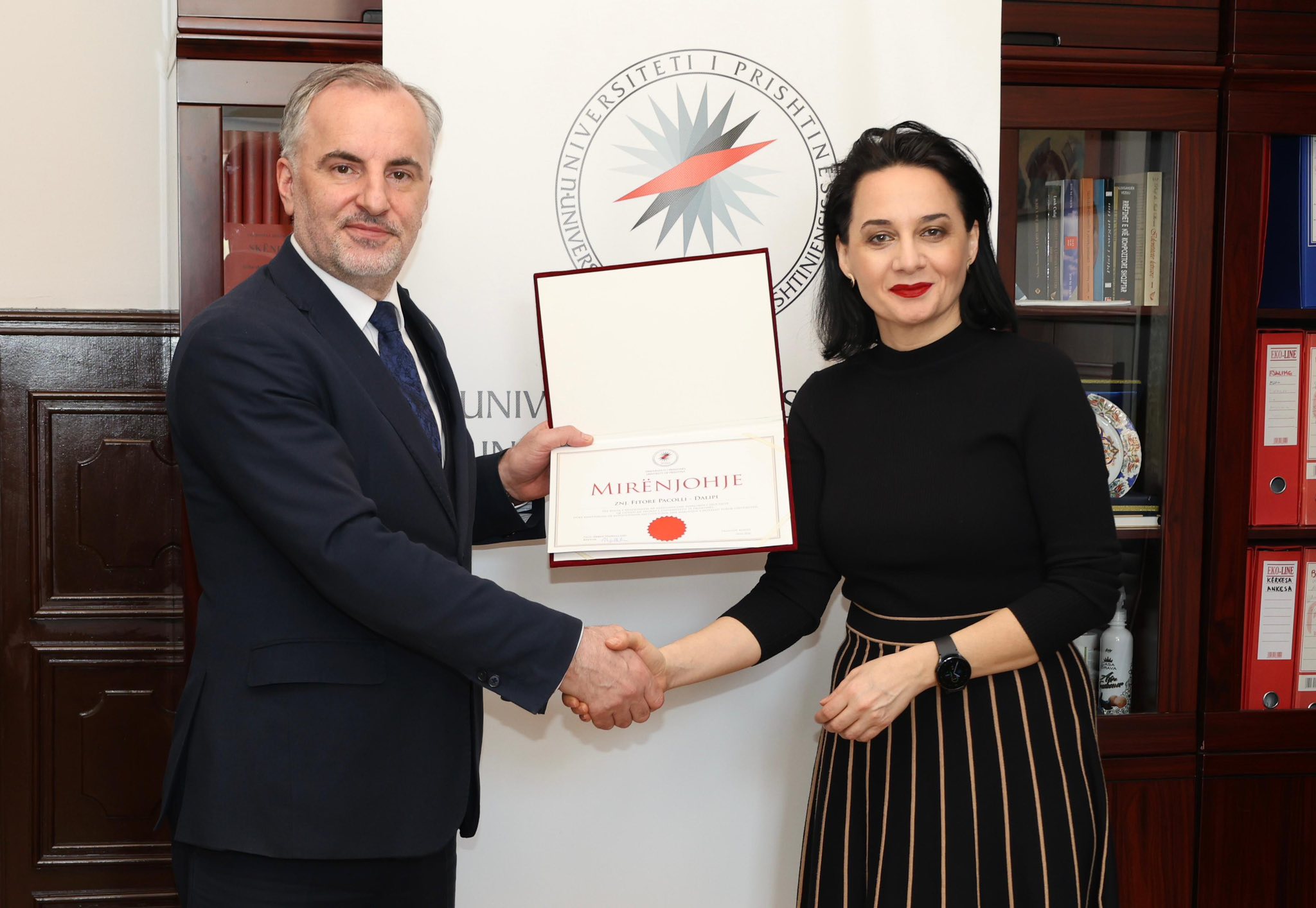 Ministrja e Mjedisit dhe Planifikimit Hapësinor, znj.Fitore Pacolli së bashku me zëvendësministrin z.Avni Zogiani, zhvilluan një takim me drejtorin për zhvillim në Ambasadën e Gjermanisë në Kosovë, z. Daniel Alker, si dhe me përfaqësues nga GIZ, z. David Oberhuber dhe znj. Marianne Alker, dhe përfaqësues nga KfW, z. Moritz Reme dhe z. Premtim Islami. Në këtë u diskutua për projektet e deritanishme të realizuara dhe për avancimin e projekteve të reja. Në veçanti, u trajtuan projektet strategjike që lidhen me sigurimin e ujit të pijshëm për qytetarët, energjinë efiçiente në objekte banimi dhe zhvillimin e qëndrueshëm. Gjithashtu, u diskutuan sfidat në menaxhimin e mbeturinave, nevoja për investime të reja dhe rëndësia e një planifikimi të mirëfilltë për të garantuar zgjidhje afatgjata dhe të qëndrueshme. Ministrja Pacolli falënderoi palën gjermane për mbështetjen e vazhdueshme ndaj Kosovës dhe ndaj Ministrisë së Mjedisit dhe Planifikimit Hapësinor. 26.02.2026Ministria e Mjedisit dhe Planifikimit Hapësinor)